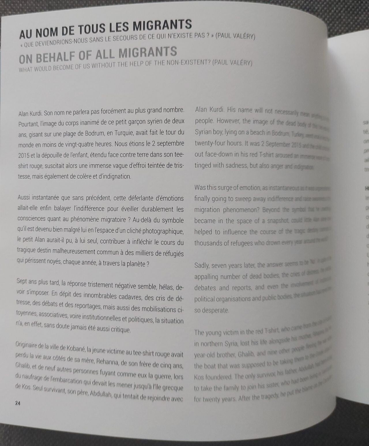 Le souvenir d'Alan Kurdi, petit garçon syrien de deux ans dont l'image de la dépouille gisant sur une plage turque avait ému et choqué le monde entier, en septembre 2015, accompagne ce texte. Un enfant sacrifié, parmi tant d'autres, devenu malgré lui un symbole de la dérive du monde et des drames infinis de la misère et de l'exil.